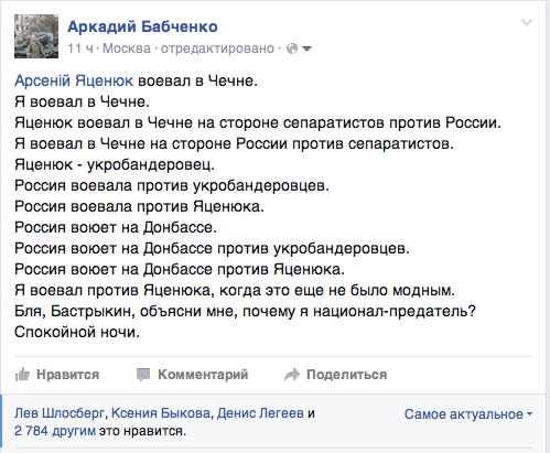 Иду по Минутке. Смотрю, Яценюк. Он мне такой - Аллаху Акбар! А я ему - ты мне еще за Севастополь, сука, ответишь.